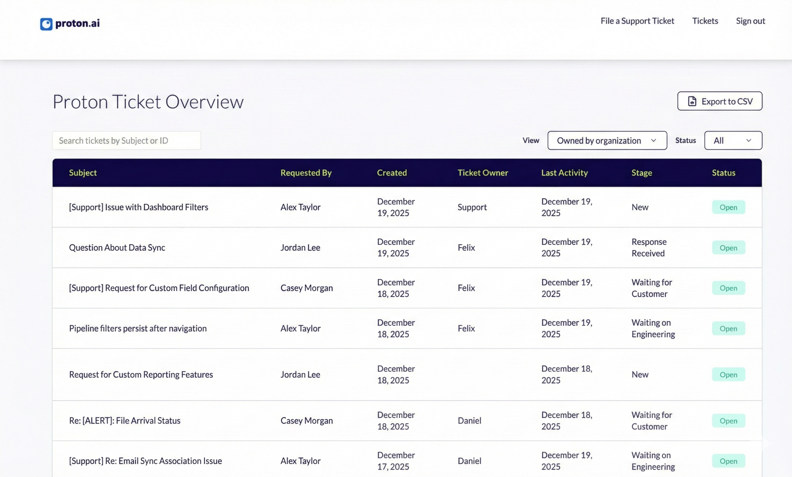 • Submit new support tickets (the same as emailing help@proton.ai)