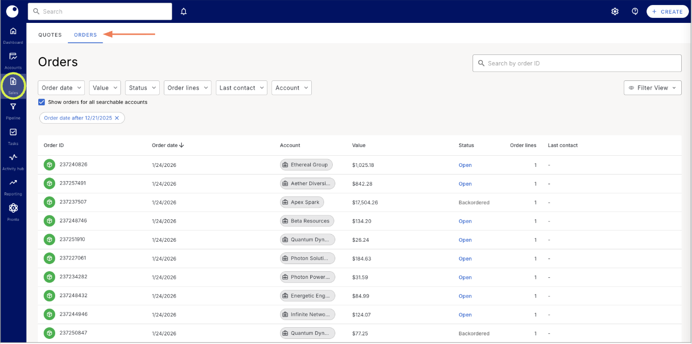 The Orders Table gives your team a dedicated view for managing and tracking orders — similar to the global views you already know and love for accounts, activities, and quotes.
