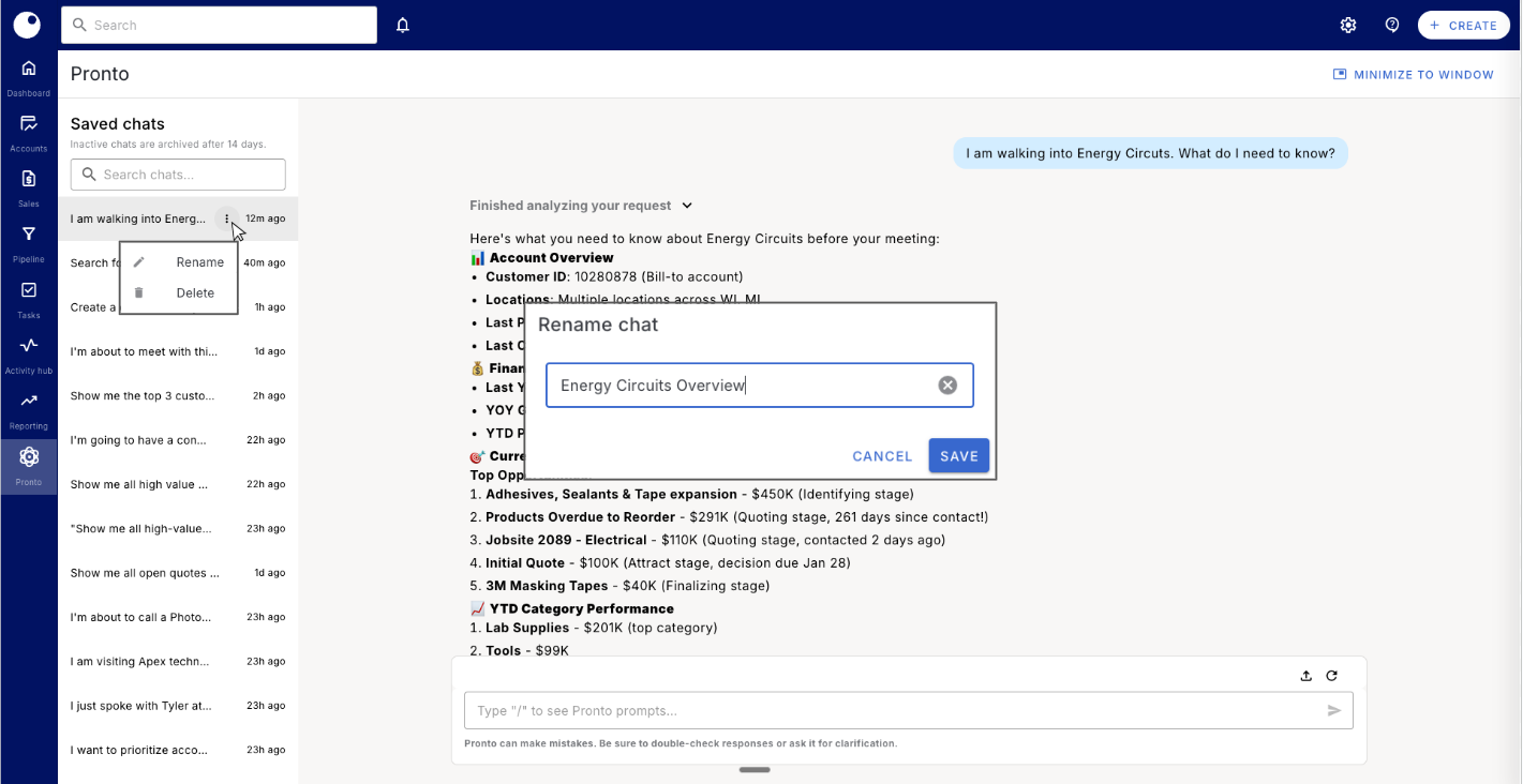 If you've been using Pronto for call planning or account prep, this makes it much easier to go back and reference what you discussed — or continue the conversation without starting over.