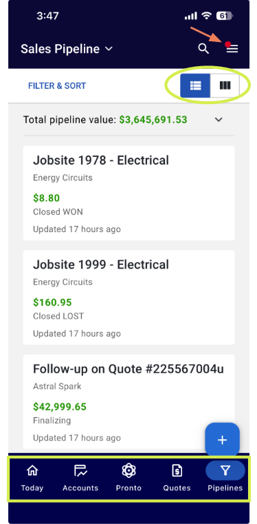Within mobile, users can now toggle between different list views (circled on the image) on the “Pipeline” tab to quickly find relevant opportunities. Whether you prefer seeing deals as cards or rows, you can switch views based on how you sell — and use the pipeline dropdown in the header to jump between different pipelines on the fly.